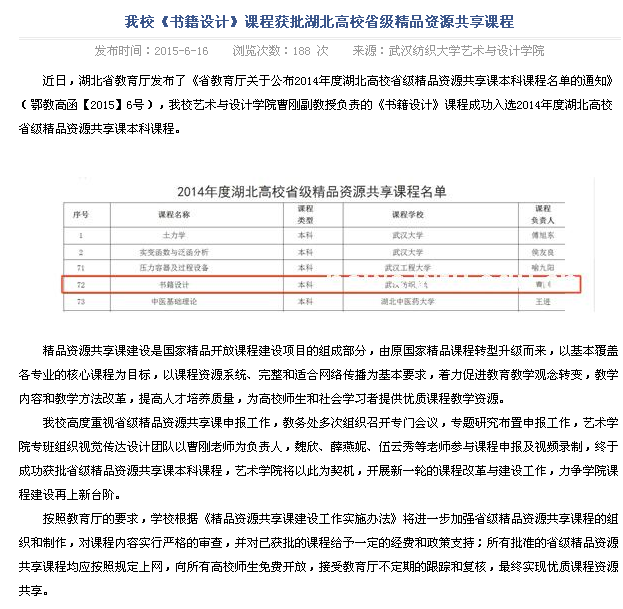 。2006年获批湖北省重点学科,2011年获批设计学一级学科硕士学位授予权,2012年获批湖北省教育厅特色重点学科,2015年获批湖北省教育厅“时尚创意文化”优势特色学科群,2017年在全国第四轮学科评估中设计学获评B-。
