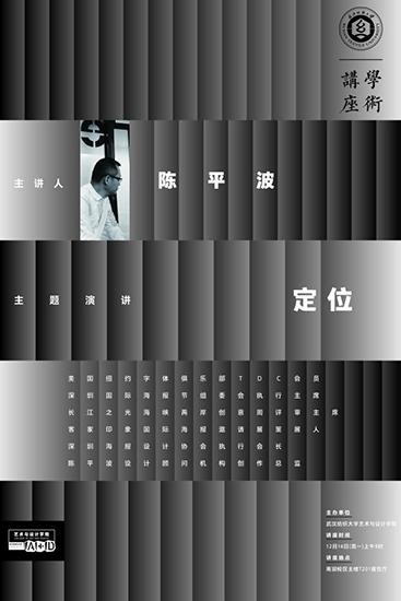 陈平波先生在讲座中结合自己设计创作实践,以深圳国际海报节、客家印象国际海报邀请展的历届优秀作品为案例,作了一场题为《定位》的讲座,分别从文字与图形的变化、海报与城市人文以及生活中的创意三个方面分享了海报创作的方法和心得。并强调设计的过程必须要注重思考、方法及生活感悟的提炼,强调“设计改变”生活,倡导培养实验性思维进行探索和创新。