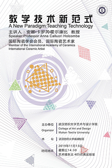 安娜·卡罗芮·霍尔康比教授,是佛罗里达大学美术学院的前院长,国际著名的陶艺家,国际陶艺协会会员,美国陶艺教育委员会的终生荣誉会员,曾连续担任过三届美国陶艺教育委员会的主席。她也是美国、法国、意大利、匈牙利和中国的常驻艺术家。曾多次主持和策划了陶艺领域的国际会议和国际展览,其作品被美国、意大利、法国、德国、澳大利亚、匈牙利、瑞士、韩国和中国等多个国家的艺术馆收藏。
