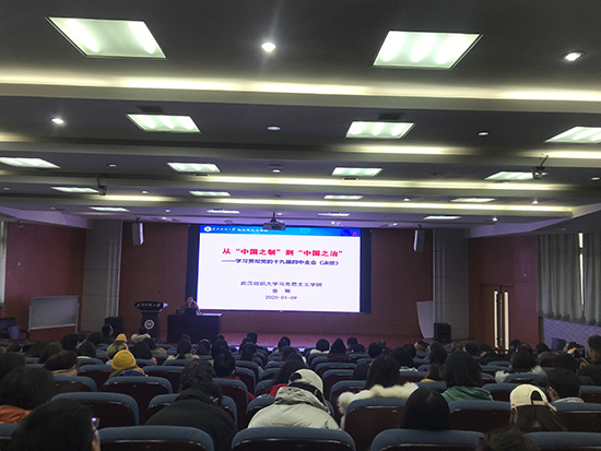 会上,马克思主义学院院长金艳教授作了题为《从“中国之制”到“中国之治”——学习贯彻党的十九届四中全会《决定》》的学习宣讲报告。金院长以十九届四中全会的重大意义为切入点,全面深刻地剖析了“中国之制”如何迈向“中国之治”。她指出,党的十九届四中全会精神对“中国之制”和“中国之治”的内在逻辑联系、内涵、成就、蓝图、优势和任务作了充分的阐明,只有坚持和完善中国特色社会主义制度、推进国家治理体系和治理能力现代化才能实现中华民族繁荣富强的“中国梦”。