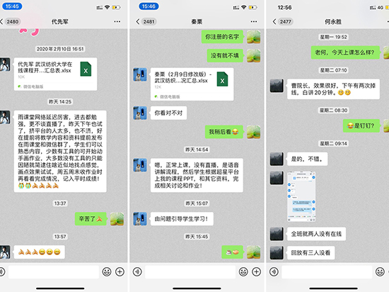 关注师生信息动态,做好教学服务。多渠道沟通获取师生信息,实时关注师生信息动态,掌握外地特别是疫情严重发病区师生的基本情况和诉求,妥善解决学生因疫情而影响的补退选、补(缓)考、重修、休(复)学、毕业设计、毕业实习等相关教学工作;对全体教师进行了线上教学资源条件特别是第一周有课的老师进行了摸底统计,按照每位任课教师、每一门课程进行了信息收集汇总,及时传达文件精神,通过网络建立班级联系,确保通知到每一位师生。细致了解教师(特别是目前尚在外地且网络不通畅的教师)实现网络授课存在的实际困难,积极为因疫情不能正常参加在线课程培训、课程教学等工作的教师,做好调课、延课等服务保障工作。