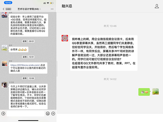 组织在线课程培训,推动教学改革。学院要求所有任课教师,特别是本学期承担教学任务的教师,选择性观看超星、慕课等教学平台组织的线上教学培训。根据各类平台使用后反馈情况以及艺术学科特色,学院委托视传团队率先建立钉钉在线课程学习微信工作群,提前直播测试后分享在线课程经验,老师们也都纷纷献计献策,尽力做到学期初学院全部任课课程实现在线教学,切实保障教学计划不缩时、教学质量不缩水。