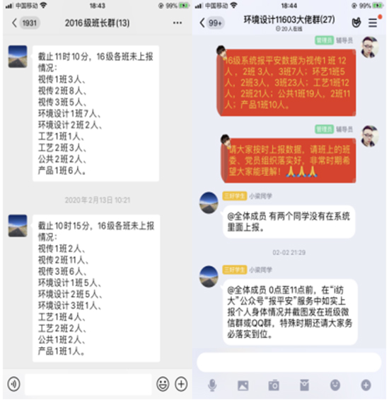 自疫情防控工作开展以来,学院全体辅导员全部进入“战时”状态,坚守岗位,尽己所能,服务学生。每一位学生的安全成了我们最大的牵挂。全院学生实行安全健康每日报告制度,对超时未报告的学生,报告为身体不适的学生,主动联系学生及家长掌握情况,排查险情。在关注学生身体健康的同时,全体辅导员积极作为,关注学生心理健康成长,学院心理工作站发布疫情期间相关心理问题的相关求助渠道和求助热线,通过各班班级心理委员将近期需要注意的相关事项及时发布并做好宣传工作。