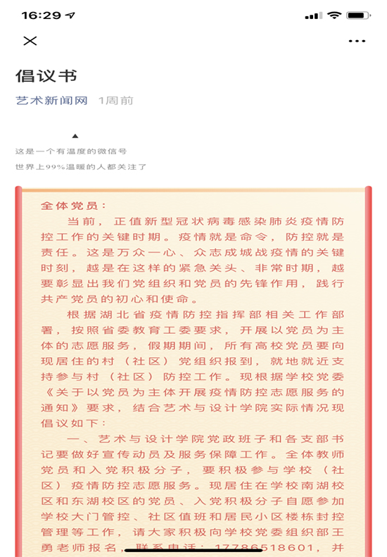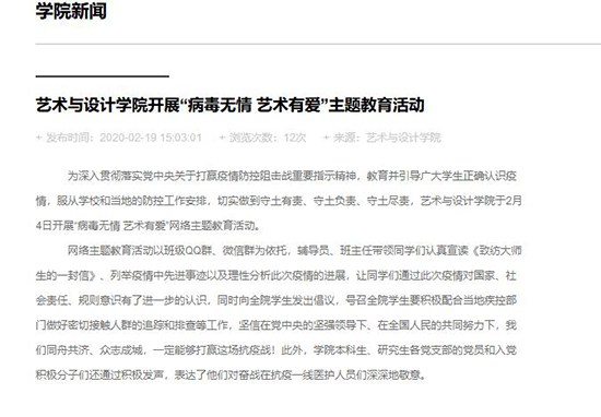 做好学生思想引领工作,防控工作开展以来,涌现出一大批英雄人物和模范代表,学院通过微信公众号等平台陆续发布《倡议书》、《艺术抗疫第一线》系列报到等多篇稿件,同时及时将国家、省市、学校相关文件以及《教育部致全国大学生的一封信》等刊载内容转发告知学生及家长;同时结合学院专业现状,举办“艺”齐战疫、战疫必胜主题文艺作品征集,以原创作品为医护人员摇旗呐喊,加油鼓气。