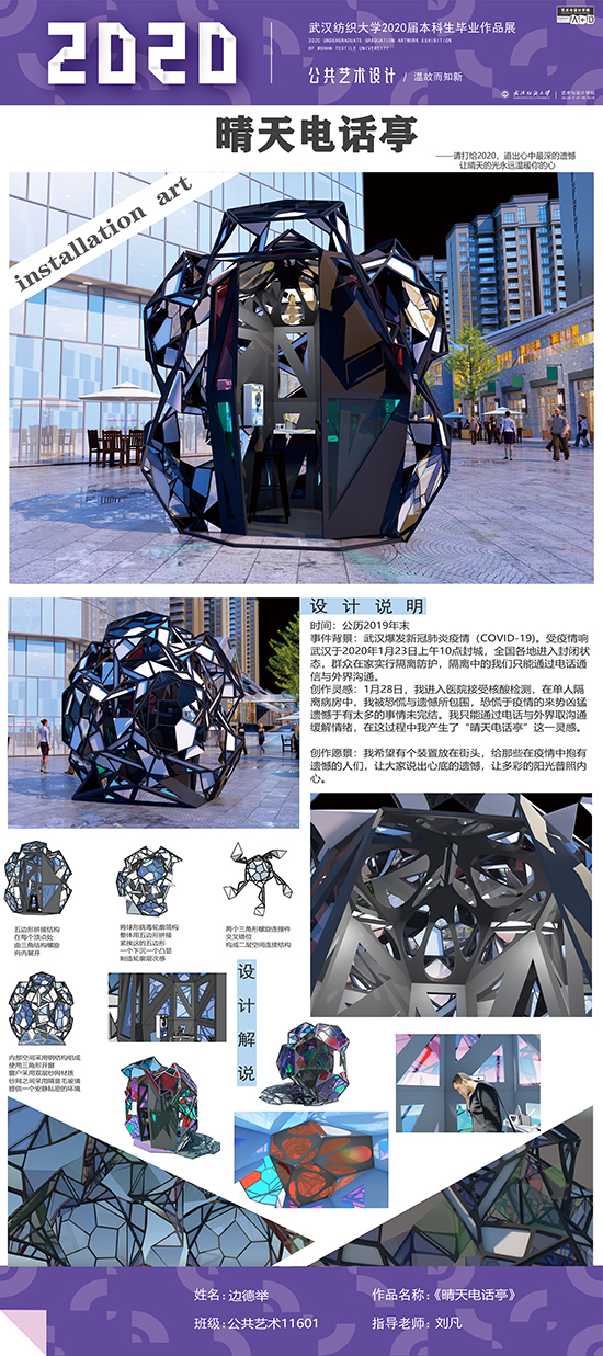 艺术改变了生活,让我们从新的视角去感受人生、体验社会、寻找生命的精彩。2020届公共艺术11601班同学们的毕业设计作品,围绕着同一个主题—温故而知新,在这些作品里能够看到每一位同学对世界、对自我的不同认知和思考,在不同的艺术形式中,我们感受到了无限的活力和想象力,并被作品丰富的创造力深深触动。毕业设计作品凝聚了同学们四年的心血,体现了我们对公共艺术的认知与创新。由于疫情原因,2020届是一群特殊的毕业生,伴随在学习和创作过程中的艰辛和迷茫都是值得珍惜的经历,所有的付出都有目共睹,这一切都将是青春最珍贵的记忆。