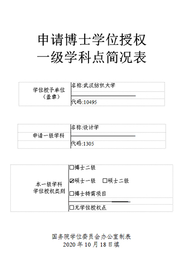 已形成以设计学、艺术学理论两个一级学科硕士学位授予点为支撑,一个艺术专业硕士学位授予点为主力的学科布局。2020年12月经省学位委员会全体会议审议通过,获湖北省2020年拟新增博士学位授权点推荐资格,实现“申博”重大突破。