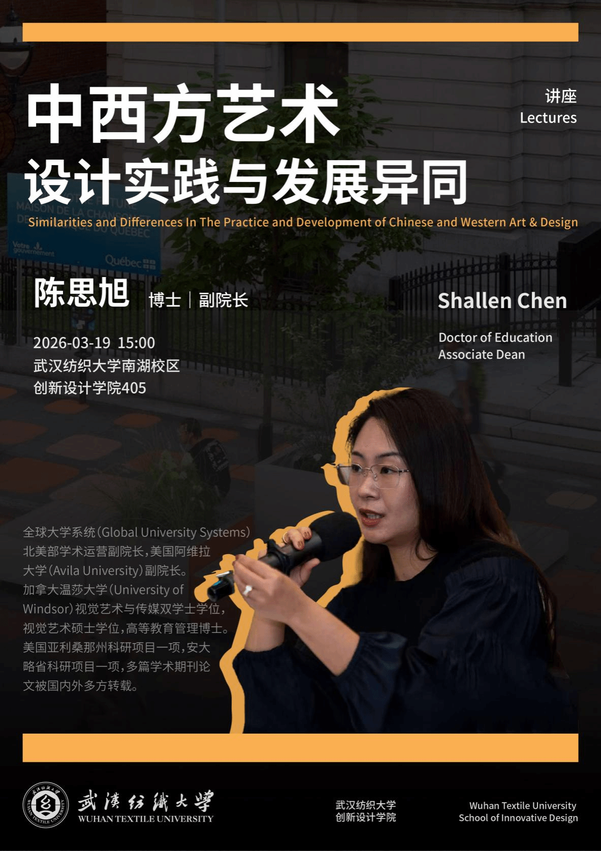 3月19日,创新设计学院在学院四楼多媒体教室举办“中西方艺术设计实践与发展异同”专题学术讲座。本次讲座特邀全球大学系统(Global University Systems)北美部学术运营副院长,美国阿维拉大学(Avila University)副院长陈思旭博士主讲,公共艺术专业教师查理博士主持,公共艺术系学生到场聆听学习。