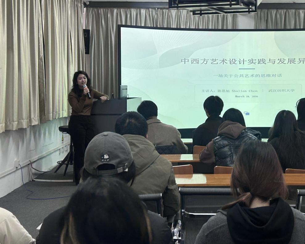 陈思旭博士重点阐述了优秀公共艺术的“三重对话”理论,即作品需实现与人、空间、文化的和谐共生,同时举例展示了作品如何深度融入当地文化语境,引发社会思考。中西方设计正呈现双向融合与升级的态势。中国公共艺术正从单纯的地标性建筑建设,向以人为本的城市服务与体验品质提升转型;西方公共艺术则从凸显艺术家个性,逐步走向与社会议题、公众生活的深度连接。在全球化与数字化背景下,陈博士特别强调,人工智能(AI)技术正成为艺术设计领域的新工具与新载体。师生需主动适应技术变革,合理利用数字化手段,把握公共艺术数字化、智能化的发展新机遇,以科技赋能艺术创作与传播。