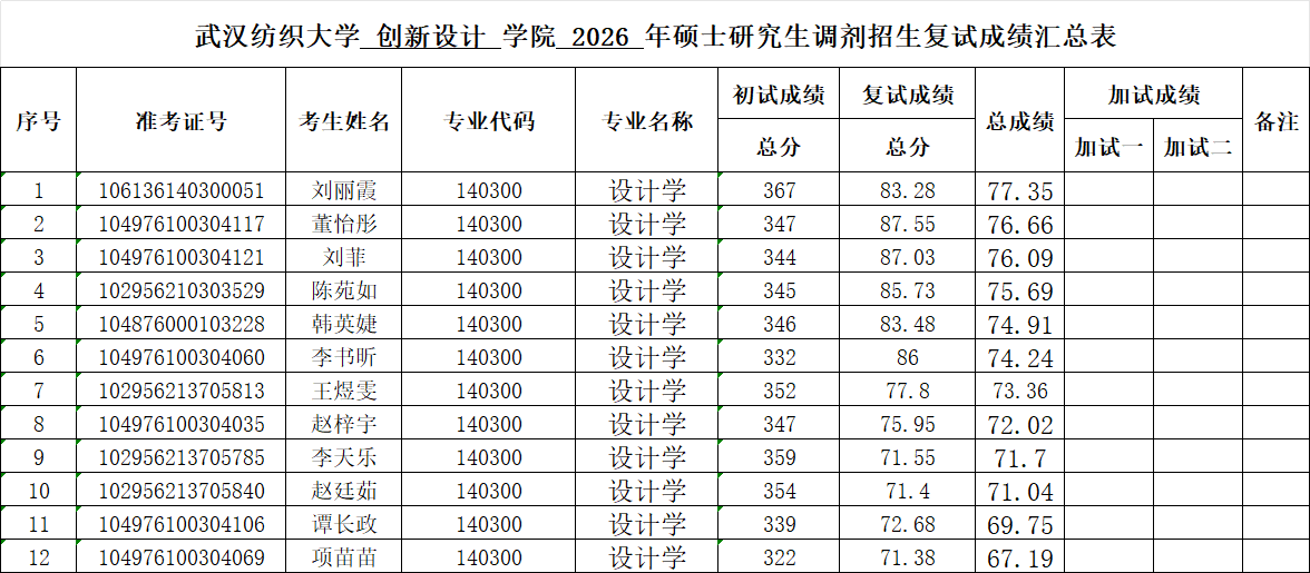 武汉纺织大学创新设计学院2026年硕士研究生复试成绩公示(调剂)