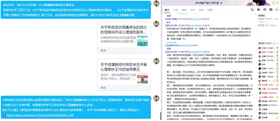 各年级辅导员主要依托QQ群、腾讯会议等平台,通过多种方式召开心理健康教育主题班会,普及关于疫情期间的心理健康知识,让同学们了解如何调适自我压力,克服恐惧和焦虑心理,照顾好自己,积极面对负面情绪。并介绍了湖北省高校心理专家服务支持热线、校心理健康教育中心咨询热线,引导有需求的同学主动联系寻求帮助。同时主动进行疫情发生之前就有心理预警学生的关怀和咨询,掌握此类学生在疫情期间的心理状况和生活状况,为需要帮助的学生提供必要的帮助。