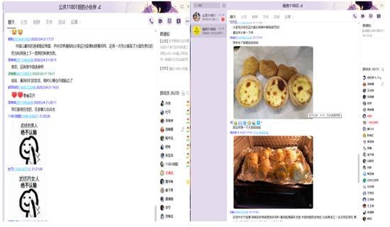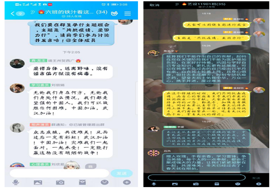 “云”班会的内容丰富,形式多样。有的以艺术工作者在抗“疫”特殊时期的角色定位、对社会的贡献的方式为题在线展开深入交流;有的以“疫情是对国家的一次考验”而开展理论学习,科普防疫知识及国防知识;有的以古诗词为灵感开展战“疫”海报讨论;还有轮番“秀”出自己美食作品,实现从厨盲到厨神的完美变身,轻松解压的班会。