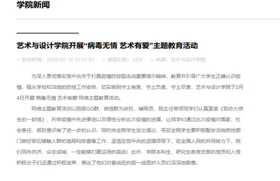 学院第一时间成立了防控新型冠状病毒肺炎疫情工作小组,明确了学生工作组的工作职责。一线辅导员老师采用微信公众号推送、微信群、QQ群、短信等多种渠道,给全院学生发布倡议书,提醒全院学生做好自身防护。充分发挥好党员、学生干部、入党积极分子等学生骨干的力量,督促同学们客观、冷静看待疫情防控工作;帮助学生提高对谣言的分辨能力,做到不信谣、不传谣,用实际行动弘扬青春正能量。通过《“艺”术抗疫第一线》系列报道积极正面宣传引导,达到关注疫情、关心学生,凝聚人心、鼓舞士气的效果。