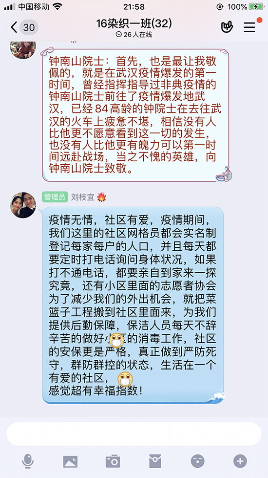16级各班同学看完主题网络视频后在班级群积极发言交流和讨论