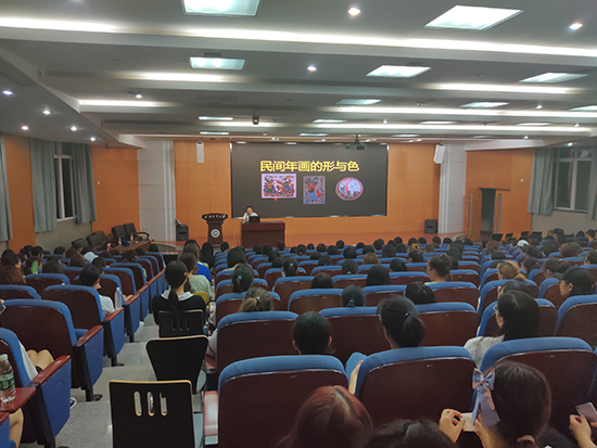 课堂上,刘老师以“民间年画的形与色”为主题,从“形”和“色”两大块内容,“男性”、“女性”和“婴童”三个方向,详细讲解了由古至今在中国各地民间年画的发展,并分析了民间年画会随时代演变的特点。同时,刘老师结合自身认识,引导同学们提升政治意识,树立正确价值观,坚定民族文化自信,弘扬和传承中华民族优秀传统文化,做传统文化的践行者、传承者、发扬者。
