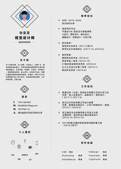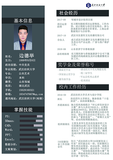 大赛共收到来自2016级本科毕业生共计200余件作品,经过评审,最终产生一等奖1名,二等奖3名,三等奖6名,优秀奖10名。简历作为求职道路上的第一关,不仅可以简要的展现出求职者的信息内容,也能让企业看到求职者的态度和“第一印象”。作为艺术生来说,这是他们的强项,通过自己所学的专业知识,将艺术融入到简历中,在带来美化的视觉效果外,也能凸显简历设计的多样性和独特性。大赛为给同学们提供了展示自我、完善自我的平台,丰富了同学们的大学学习生活,激发了同学们的创造力和想象力,提升了同学们制作简历的专业水平,增强同学们的就业能动性,进一步提高同学们在求职道路上的竞争力。