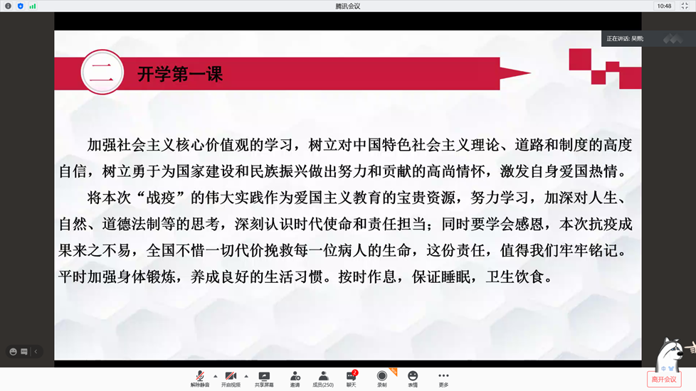 活动伊始,吴老师从党的领导、文化自信、道路自信、制度自信等方面入题,结合学校在战疫中涌现出来的先进事迹,将理论与实践相结合,给大家讲了一堂深刻的爱国主义教育课。吴老师强调中国共产党是我们的“主心骨”、“定盘星”,这场与疫情的殊死搏斗充分展现了中国力量、中国精神和中国效率。无数的榜样在逆境中挺立、无数的精神在绝境中彰显。在抗击疫情中,以爱国主义为核心的家国情怀深深融入了中华民族的血脉。从医务工作者到社区工作者,从公安民警到基层干部,从快递小哥到志愿者,每一个人都自觉投入到疫情防控工作中。随着国家治理体系和治理能力的不断提升,在党中央的坚强领导和中国特色社会主义制度的巨大优势下,我们的祖国一定会战胜疫情。他要求2019级全体同学,一定要高度重视安全防护,强化自我教育,遵守学校防控要求,积极配合相关防疫工作,发挥新时代青年模范作用,协助年级老师做好疫情防控管理工作。
