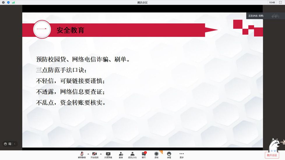 2019级全体学生通过腾讯会议平台开展了安全教育讲座,讲座由2019级辅导员吴熙老师主讲。