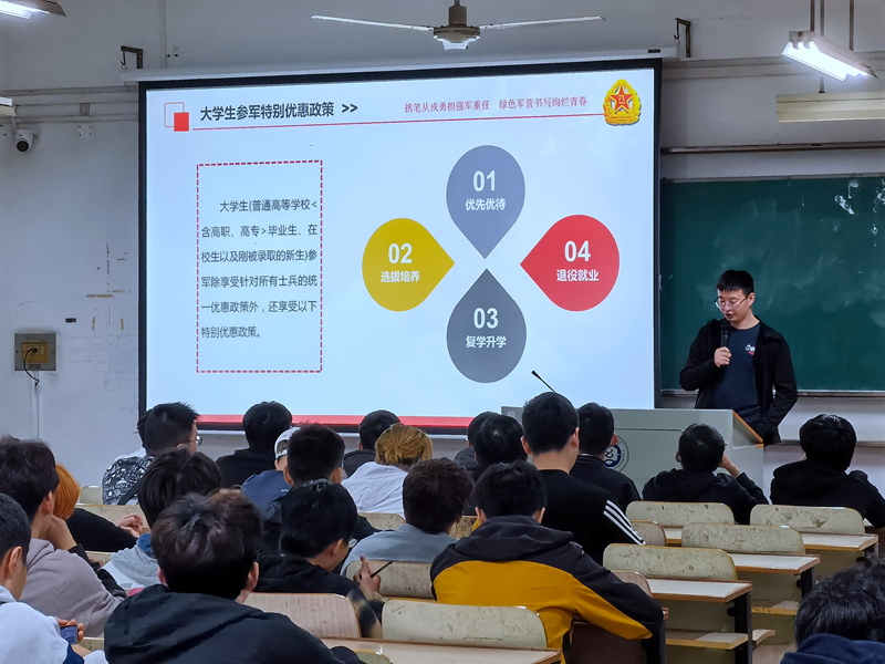 活动伊始,张老师首先简单介绍了应征入伍的基本条件,随后又对报名参军的基本流程、保留学籍与学费补偿以及优惠政策的情况进行了详细的介绍。最后,他阐述了大学生应征入伍对自身塑造和锻炼成才的重要意义,同时鼓励同学们积极投身军营,锻炼自己的意志与能力。