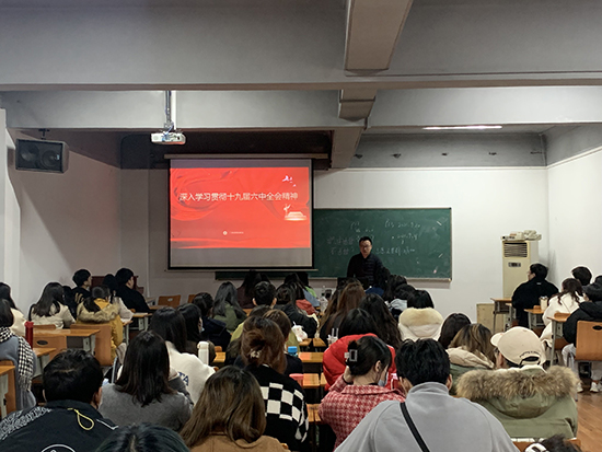 在二楼多媒体教室组织了全体研究生学习贯彻党的十九届六中全会精神,由学院研究生辅导员张舟老师主持。