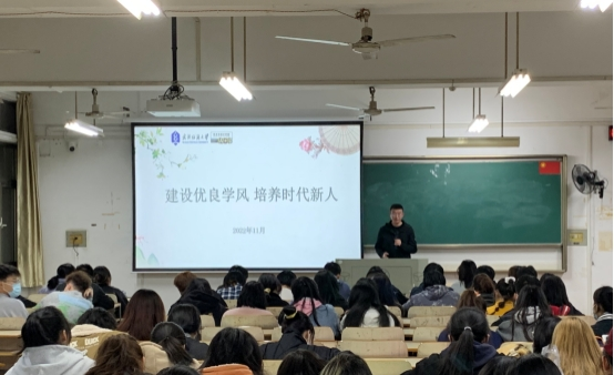 为营造良好学术生态,弘扬优良学风,培养学生学术科研思维与创新能力,11月15日晚上七点,辅导员张啸海老师以“建设优良学风,培养时代新人”为主题为2021级学生讲授团课,2021级295名学生参加学习。