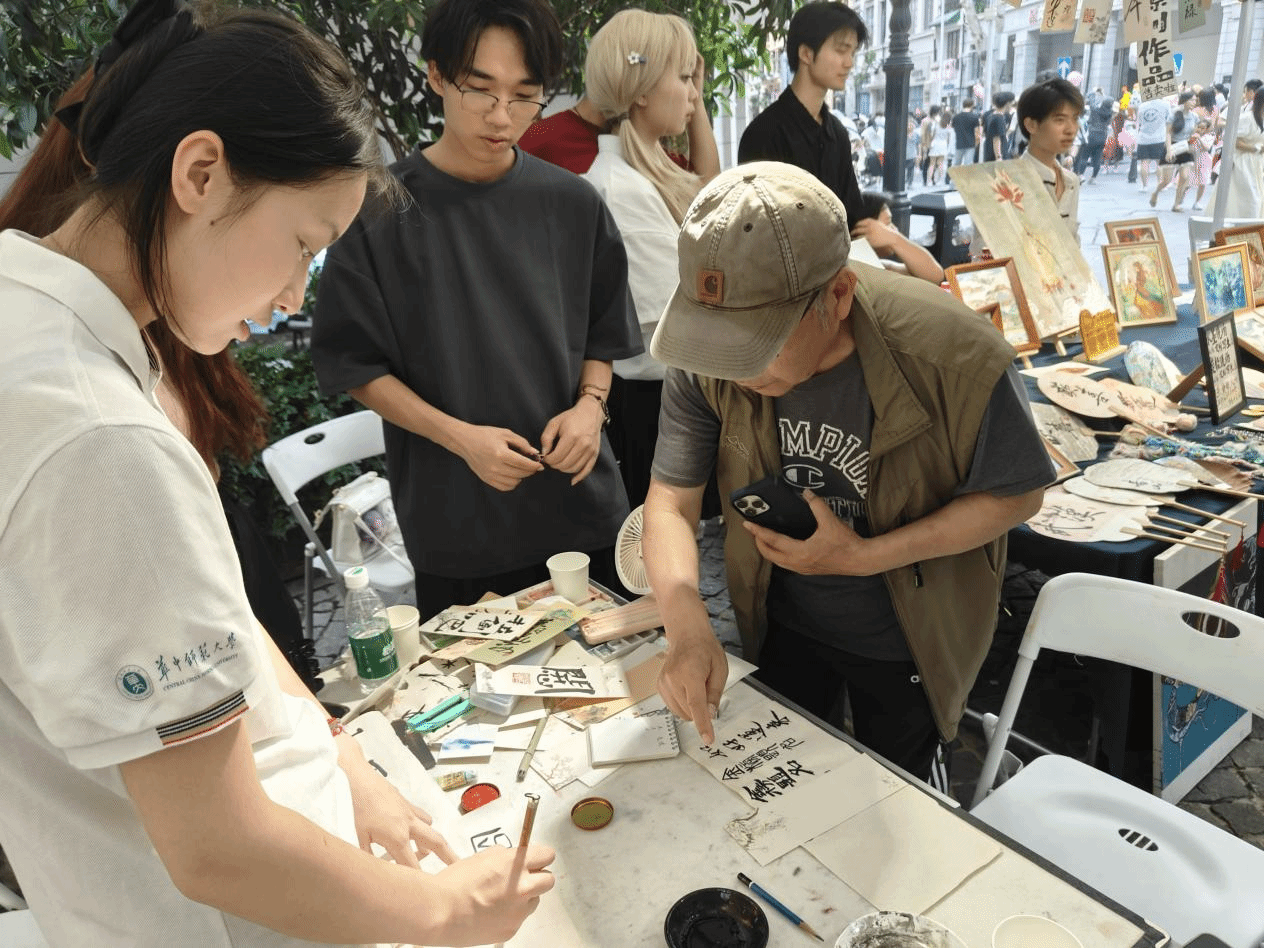 在集市中,还发生了一段温馨的偶遇。曾在武汉纺织厂工作,后在美国生活二十余年的彭先生偶然来到集市。看到武汉纺织大学的“观意”工作室,他感到十分亲切。彭老先生不仅与工作室成员分享了他的书法心得,还现场教授了一些书法技巧,让这次集市成为了一次难忘的书法交流体验。
