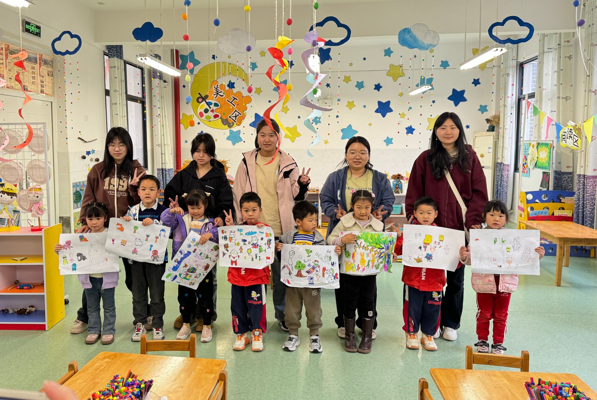 活动中,同学们分组带领孩子们体验了创意绘画等课程,为他们讲解绘画基础知识和手法技巧,孩子们手握画笔,在同学们的耐心帮助下,尝试着画出自己心中的色彩,在色彩斑斓的画笔和彩纸间,孩子们充分发挥想象力,创作出充满童趣的作品。